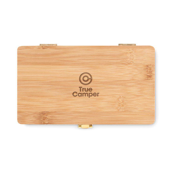 Zestaw narzędzi prezentowany w bambusowej walizce zawiera 3 śrubokręty, 10 bitów w uchwycie, 3 wielkości szczelinowe, 3 wielkości Torx i 1 adapter, 4 nasadki, 1 frez, 1 uchwyt i 1 łącznik. Bambus jest produktem naturalnym, dlatego mogą wystąpić nieznaczne różnice w kolorze, wzorze i rozmiarze.