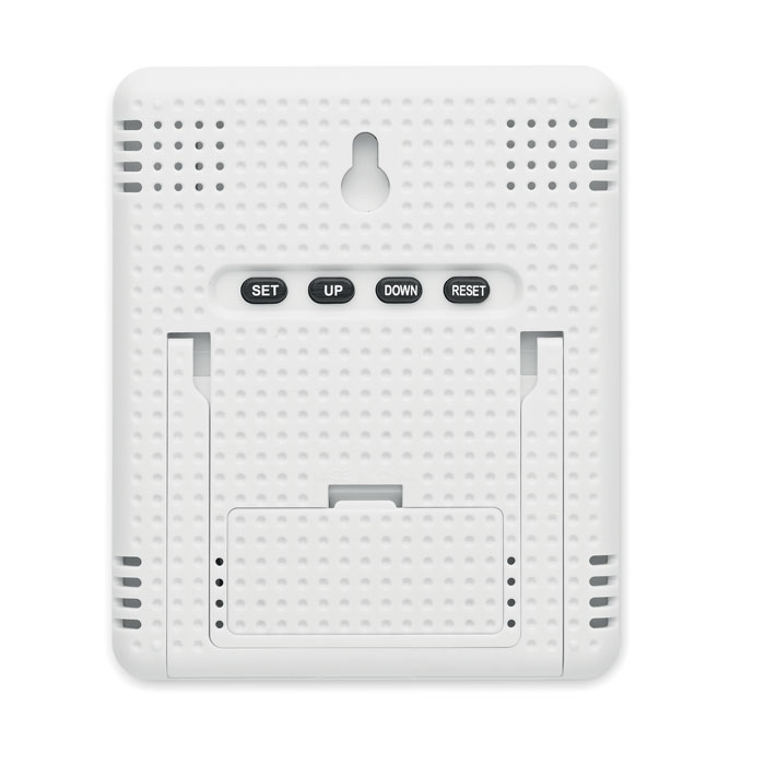Stacja pogodowa z bambusowym frontem, wielofunkcyjny termometr. Zawiera zegar, wskaźnik temperatury, wilgotności powietrza i kalendarz. Baterie (2 szt. AAA) nie są częścią zestawu. Bambus jest produktem naturalnym, dlatego mogą wystąpić nieznaczne różnice w kolorze, wzorze i rozmiarze.