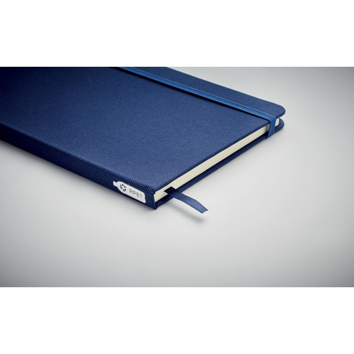 Notatnik A5 z twardą okładką 600D RPET. 160 stron (80 kartek) w linie z papieru ekologicznego. Dopasowany elastyczny pasek zamykający i zakładka z tasiemki.
