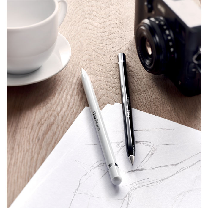 Długotrwały aluminiowy długopis bez wkładu. Długopis pisze końcówką ze stopu metalu.