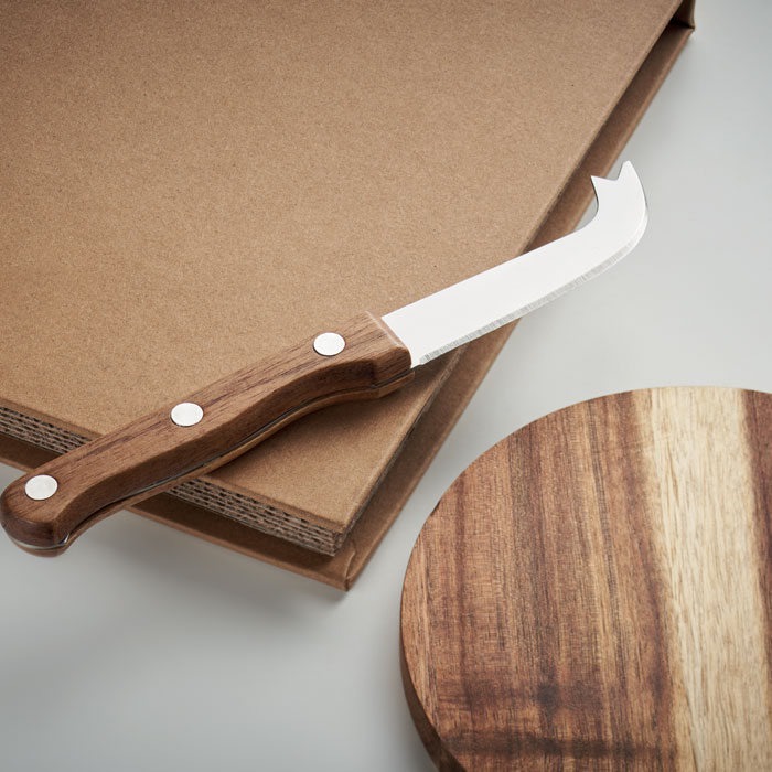 Mała deska do serów z drewna akacjowego z nożem ze stali nierdzewnej. Prezentowana w kartonowym pudełku upominkowym. Drewno jest produktem naturalnym, dlatego mogą występować niewielkie różnice w kolorze i rozmiarze poszczególnych elementów, co może mieć wpływ na ostateczny efekt zdobienia.