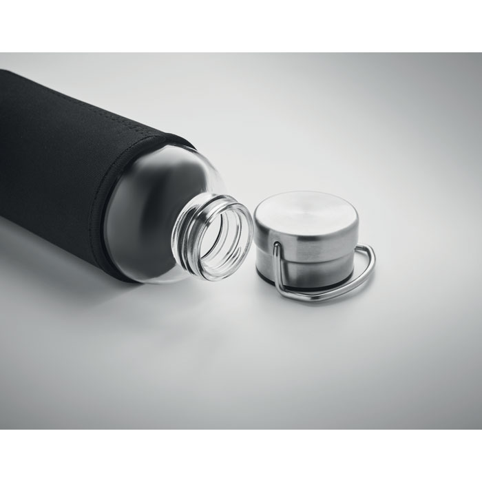 Szklana butelka z zakrętką z uchwytem wykonanym ze stali nierdzewnej w neoprenowym etui. Nie nadaje się do napojów gazowanych. Nie przecieka. Pojemność: 500 ml.
