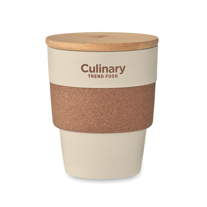 Jednościenny kubek z PP z recyklingu z korkową opaską ochronną i bambusową pokrywką. Pojemność: 300 ml. Ponieważ jest to kubek jednościenny, może wystąpić zjawisko przenoszenia ciepła. Bambus jest produktem naturalnym, dlatego mogą wystąpić nieznaczne różnice w kolorze, wzorze i rozmiarze.