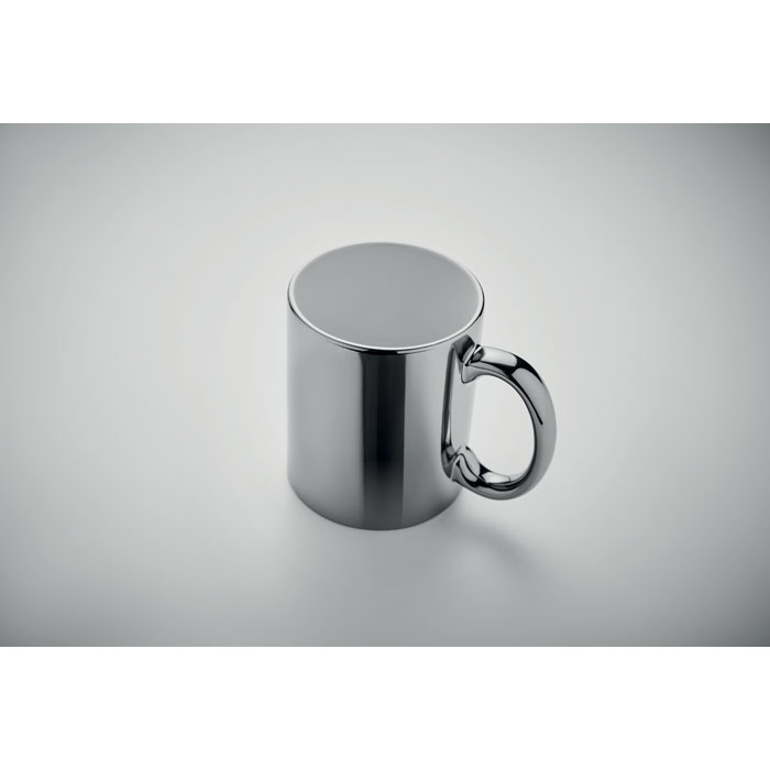 Klasyczny, cylindryczny kubek ceramiczny z metalicznym wykończeniem. Pojemność: 300 ml.