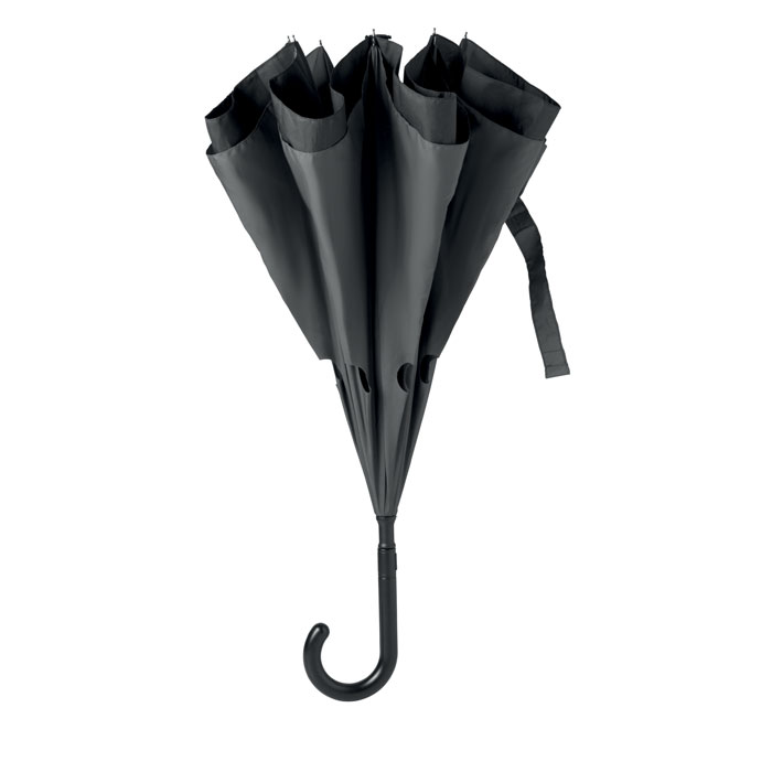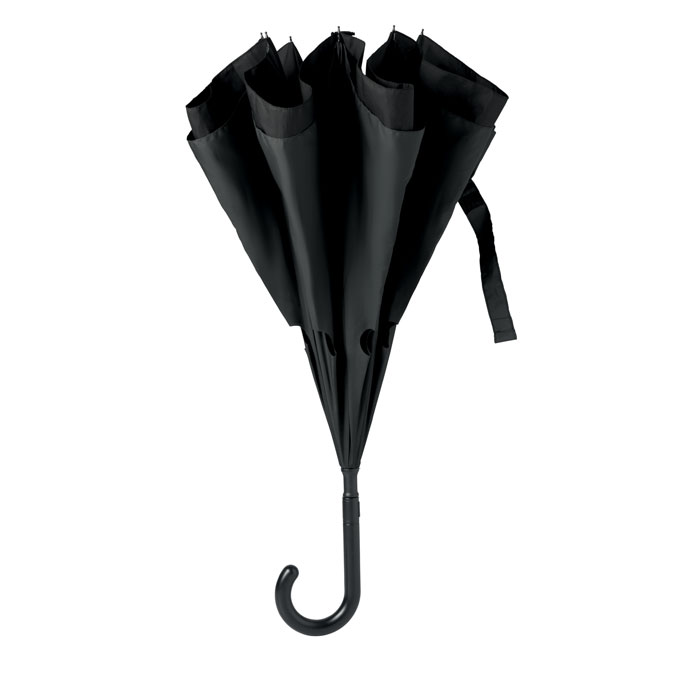 Parasol 23”, otwierany odwrotnie, podwójna warstwa, żebra i trzon z włókna szklanego, materiał 190T pongee. Otwierany manualnie, składany automatycznie.