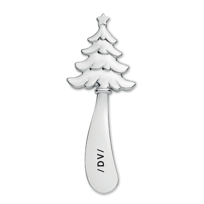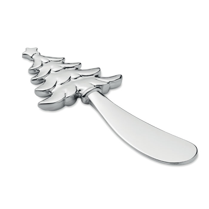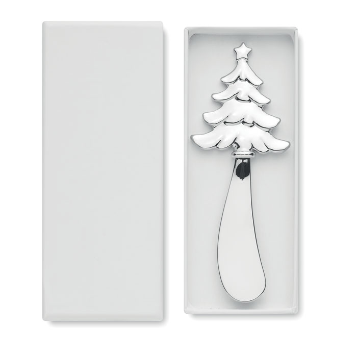 Nóż do masła ze stopu cynku w kształcie choinki. Prezentowany w pudełku upominkowym.