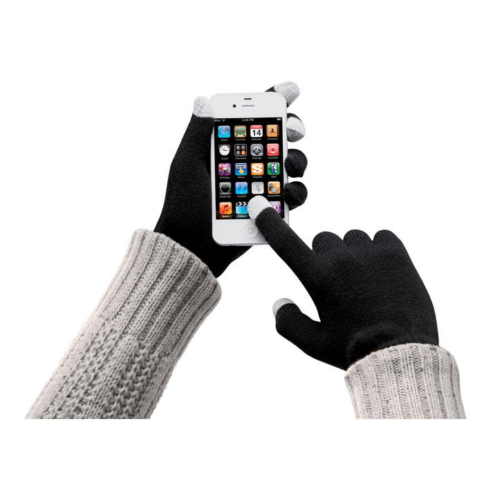 Akrylowe rękawiczki dotykowe do smartfona. 3 dotykowe końcówki palców składają się z 0,5% w włókna ze stali nierdzewnej, 89,5% z akrylu, 10% ze spandexu. Rozmiar rękawiczek może się nieco różnić ze względu na dodany spandex.