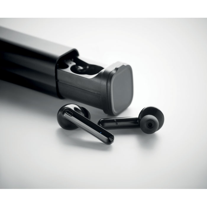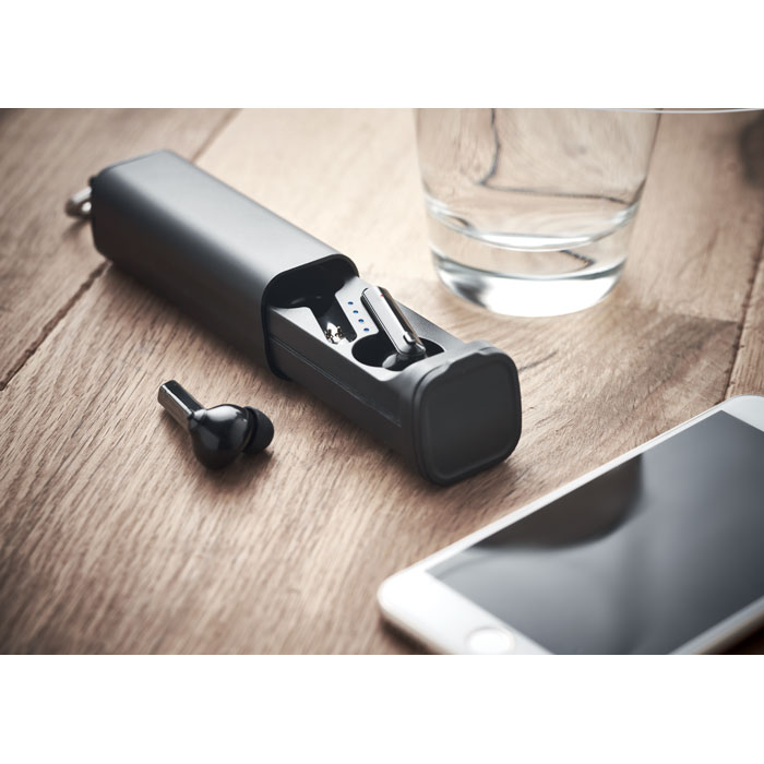 True Wireless Stereo (TWS) 5.0 bezprzewodowe słuchawki douszne z mikrofonem i wbudowanym akumulatorem 35 mAh. Czas odtwarzania około 3 godziny. Automatyczne parowanie. W zestawie kabel do ładowania micro USB i stacja ładująca 250 mAh. Z brelokiem do kluczy i podstawką na telefon.