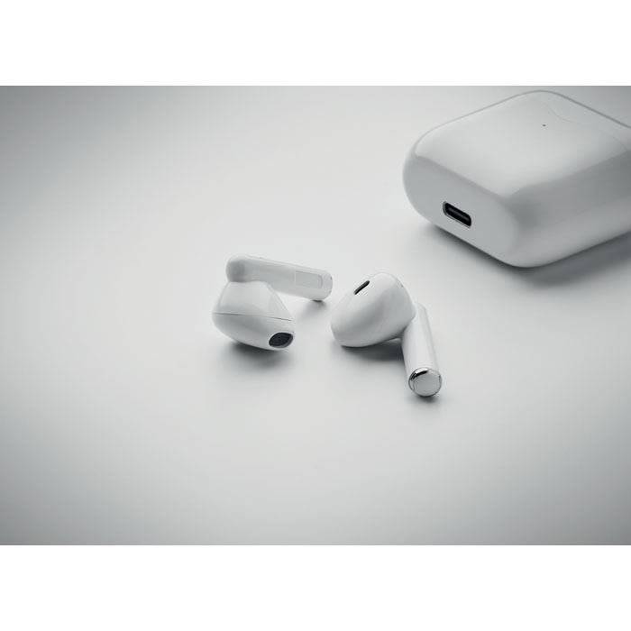 Bezprzewodowe słuchawki stereo ABS (TWS) 5.3 z mikrofonem, wbudowanym akumulatorem 30 mAh i ładowarką 200 mAh. Czas odtwarzania ok. 4 godzin. Automatyczne parowanie.