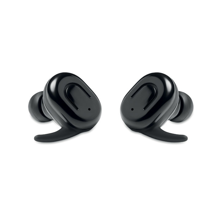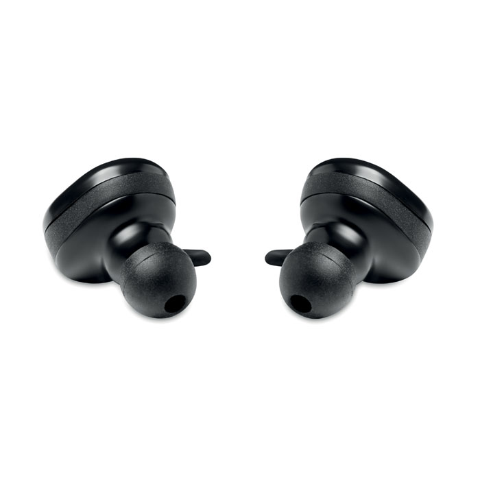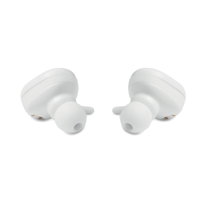 Zestaw 2 bezprzewodowych słuchawek dousznych TWS 5.0 z mikrofonem i wbudowanym akumulatorem 45 mAh. Czas odtwarzania ok. 3 godziny. Automatyczne parowanie. W komplecie kabel do ładowania micro USB. Prezentowane w pudełku, które pełni również funkcję stacji ładującej z akumulatorem Li-ion 250 mAh.