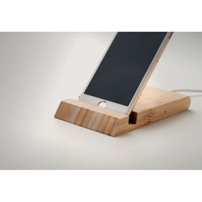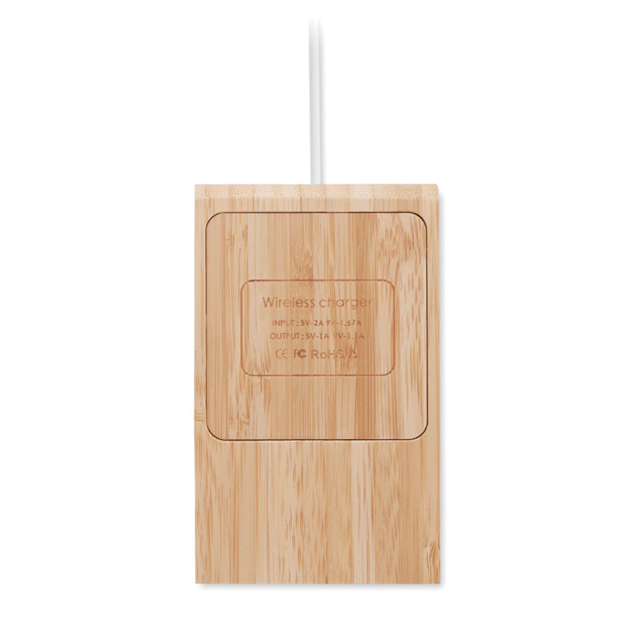 Bambusowa ładowarka bezprzewodowa 10W z funkcją podstawki. Wyjście: DC 9V/1.1A odpowiednie do szybkiego ładowania. Kompatybilna z najnowszymi modelami Android, iPhone® 12 i nowszymi. Bambus jest produktem naturalnym, dlatego mogą wystąpić nieznaczne różnice w kolorze, wzorze i rozmiarze.