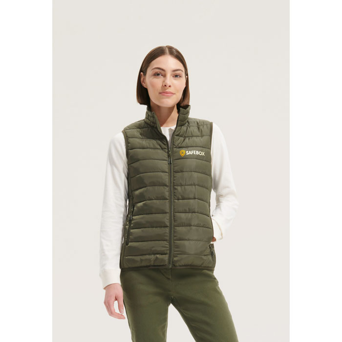 SOL’S STREAM BW WOMEN, damski lekki bezrękawnik, materiał zewnętrzny i podszewka: 100% poliester, wypełnienie: 100% poliester puch. Przednie zapięcie i boczne kieszenie z nylonowym zamkiem błyskawicznym. Metalowe suwaki z czarnymi fantazyjnymi suwakami. Wysoki kołnierz i elastyczne wiązanie na ramionach i na dole, dostarczane z torbą do przechowywania. Informacje na temat dopasowania rozmiarów można znaleźć w tabeli rozmiarów w sekcji dokumentacji produktu.