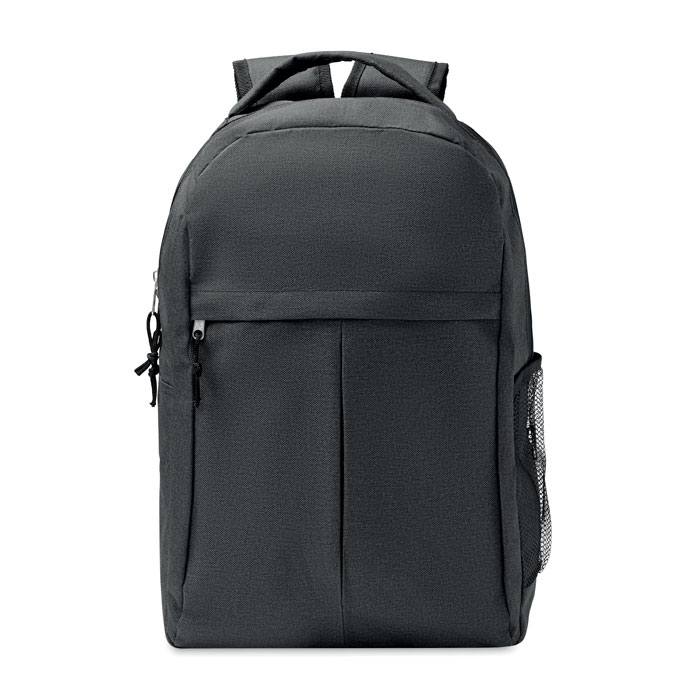Plecak z poliestru 600D RPET melanż, z zewnętrzną kieszenią na zamek i kieszenią z siatki z boku.